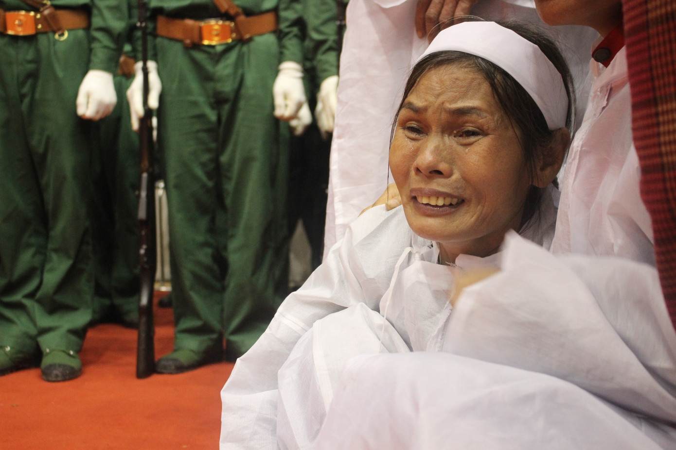 Thân nhân một liệt sĩ ngất lịm khi ban tổ chức lễ tang đọc đến tên người thân của mình. Bà Quyên, mẹ liệt sĩ Lê Tuấn Anh (SN 2000, Quảng Trị) liên tục gọi tên con khi lễ di quan bắt đầu.