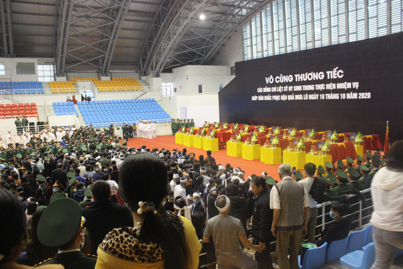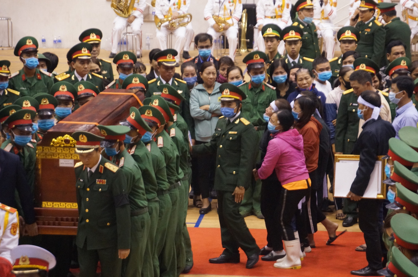 Tại Lễ tang diễn ra sáng nay (22/10), hàng nghìn người bao gồm thân nhân, đồng đội và người dân có mặt tại Nhà Đa năng TP. Đông Hà để tiễn đưa 22 chiến sĩ hi sinh khi làm nhiệm vụ tìm kiếm, cứu hộ, cứu nạn và khắc phục hậu quả thiên tai thuộc Đoàn Kinh tế - Quốc phòng trên địa bàn thôn Cợp (xã Hướng Phùng, huyện Hướng Hóa, tỉnh Quảng Trị).