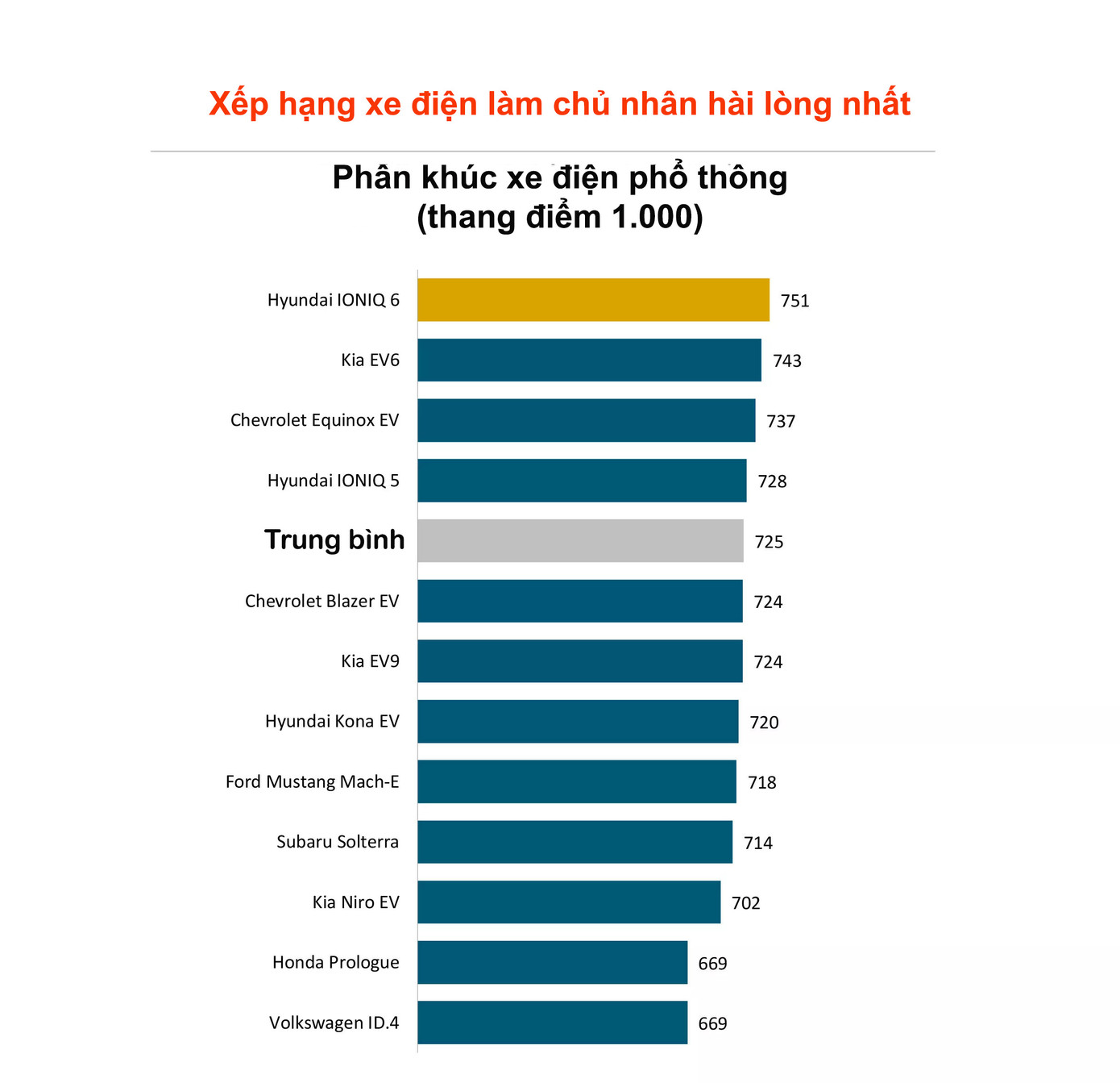 Ở phân khúc xe điện phổ thông, Hyundai Ioniq 6 dẫn đầu về mức độ hài lòng của chủ sở hữu với điểm số 751. Những mẫu xe khác đạt điểm cao trên mức trung bình của phân khúc gồm Kia EV6 (743 điểm), Chevrolet Equinox EV (737 điểm) và Hyundai Ioniq 5 (728 điểm).