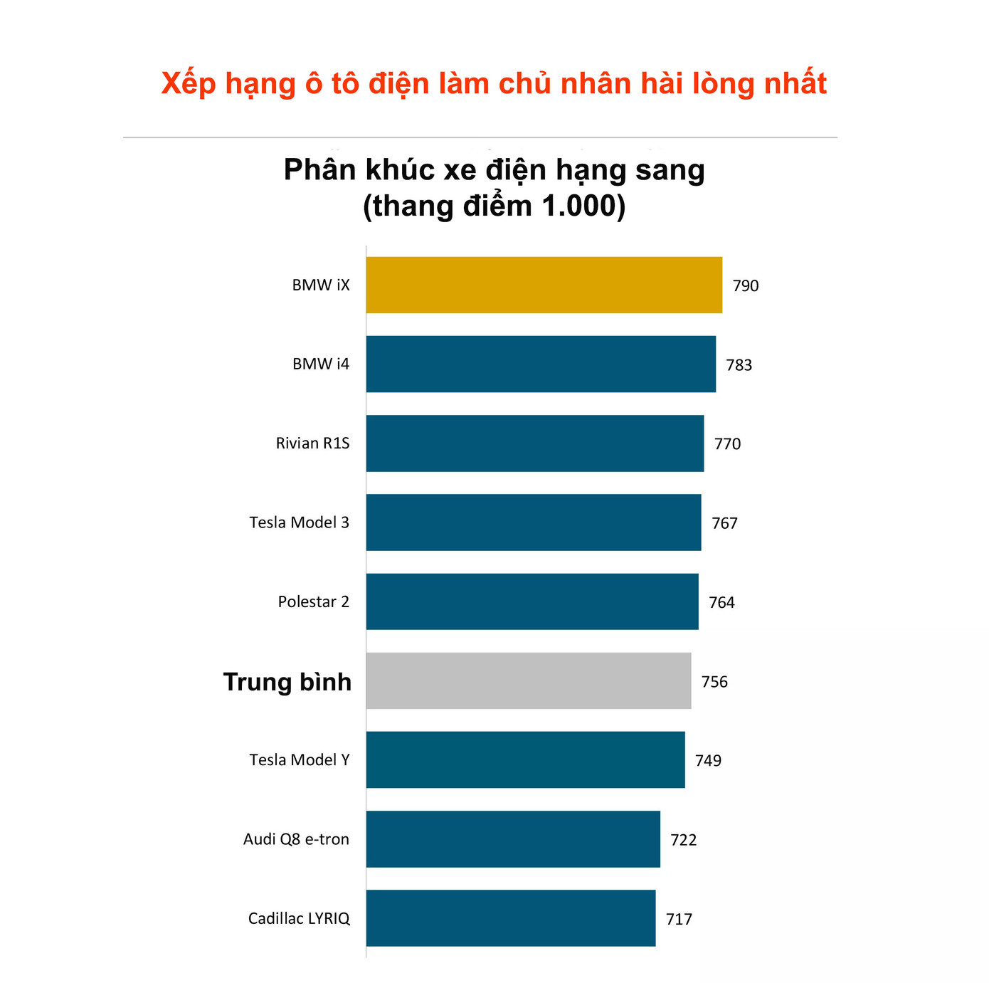 Theo kết quả được J.D Power công bố, BMW iX dẫn đầu bảng xếp hạng với số điểm 790/1.000, qua đó trở thành mẫu xe được đánh giá cao nhất trong phân khúc xe điện hạng sang. Xếp sau iX là mẫu xe đàn em BMW i4 với 783 điểm. Rivian R1S của Mỹ đứng thứ ba với 770 điểm, tiếp đến là Tesla Model 3 (767 điểm) và Polestar 2 (764 điểm).