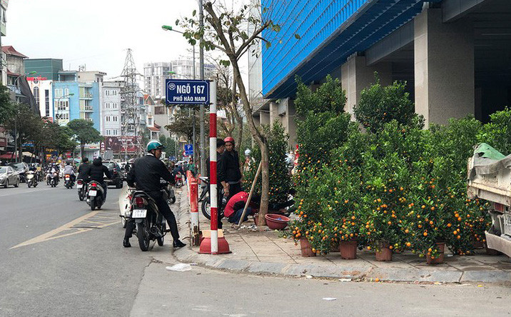 Tuy nhiên, trên các tuyến đường của Hà Nội la liệt các “chợ cóc, chợ tạm” mọc lên. Việc lấn chiếm vỉa hè dịp Tết diễn ra liên tục còn khiến cho nhiều tuyến đường liên tục ùn tắc, tiềm ẩn nguy cơ mất an toàn giao thông.