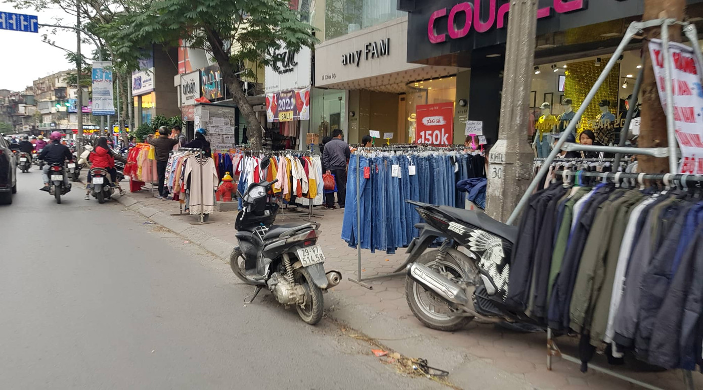 Phố Chùa Bộc, Phạm Ngọc Thạch (quận Đống Đa) tuy không phải giờ cao điểm nhưng tuyến phố vẫn bị ùn tắc. Nguyên nhân là gần như tất cả các cửa hàng quần áo bên dãy số lẻ phố Chùa Bộc đều mang giá treo, quần áo ra vỉa hè bày bán.