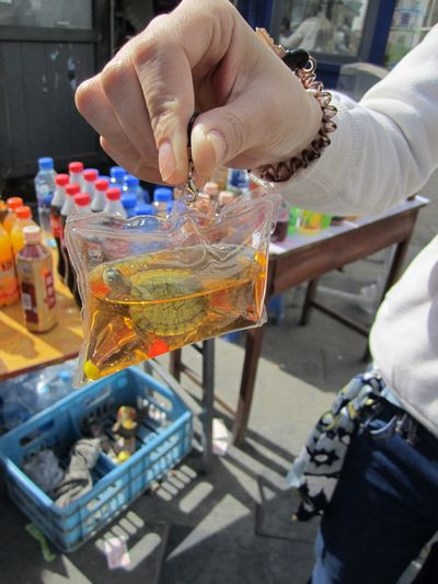 Để làm nên chiếc móc chìa khóa bong bóng này, nhà sản xuất đã phải lựa chọn những vật nuôi nhỏ bé như cá vàng, rùa tai đó, ếch, kì nhông… có màu sắc sặc sỡ, rồi sau đó đổ thêm nước vào và đóng kín.