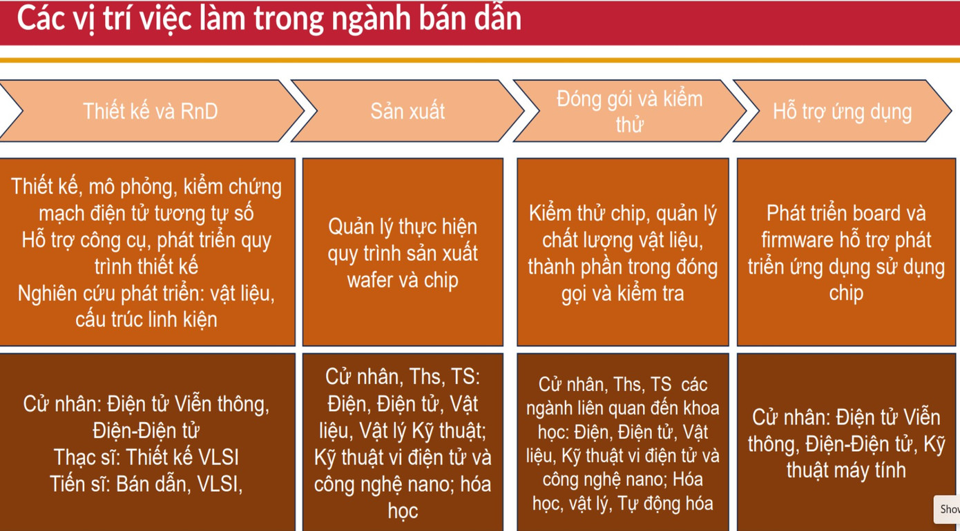 Ở Việt Nam, đại diện ĐH Bách khoa Hà Nội cho hay hiện nay có 5.000 kỹ sư, nhu cầu mỗi năm tăng 10-15%. Trong đó, chủ yếu là kỹ sư thiết kế (vật lý, layout), kiểm thử (DV).