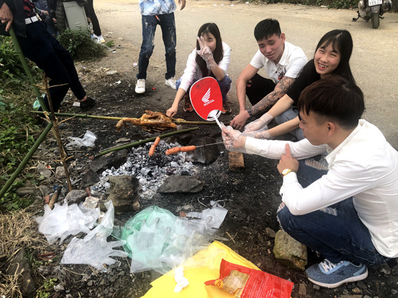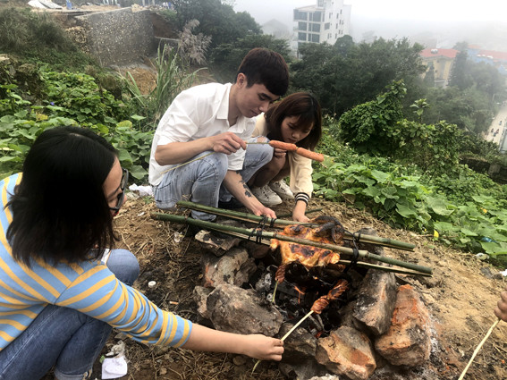 Các bạn trẻ thoái mái xếp đá, bẻ cây lảm bếp nướng