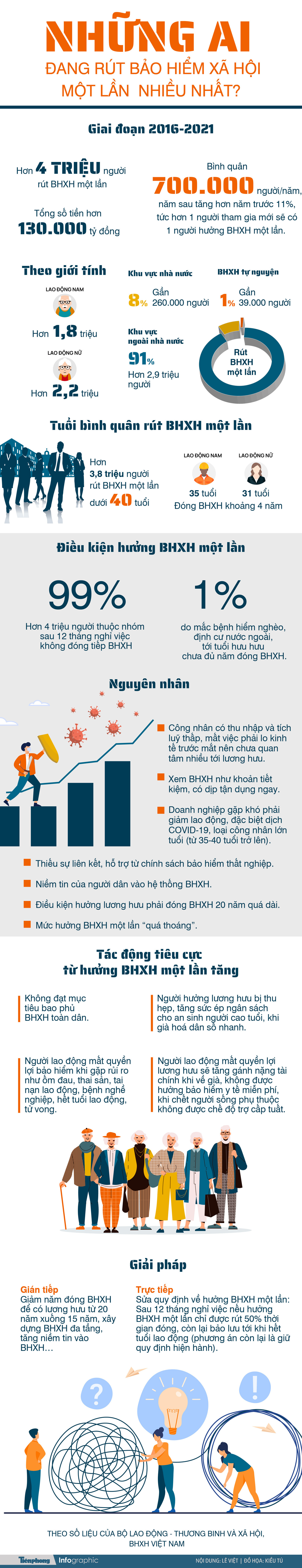 TPO - Mỗi năm cả nước có hơn 700.000 người rút bảo hiểm xã hội (BHXH) một lần và năm sau luôn cao hơn năm trước. Bình quân cứ hơn 1 người tham gia BHXH có 1 người rút. Nhóm lao động dưới 40 tuổi, làm ở khu vực doanh nghiệp đang rút BHXH một lần nhiều nhất.