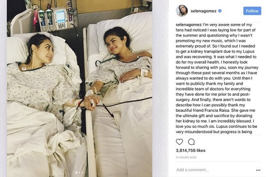 Selena Gomez tiết lộ cô vừa trải qua một ca ghép thận. Đây là khoảnh khắc cô chụp cùng Francia Raisa - người hiến thận và cũng đồng thời là người bạn thân thiết lâu năm của Selena. Bức ảnh gây bão với 10,3 triệu Like.