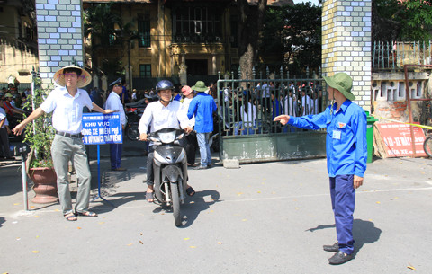 | Lực lượng sinh viên tình nguyện làm hàng rào xanh trước cổng nhà Đại tướng để tránh gây ùn tắc, chen lấn, xô đẩy. |