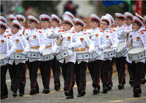 Lễ diễu hành bắt đầu với “Hành khúc gặp gỡ kỷ niệm” được biểu diễn bởi 900 nhạc công. Ảnh: Sputnik