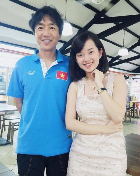 Bạn gái Khánh Ly của Mạc Hồng Quân có mặt tại Singapore cổ vũ U23 Việt Nam thi đấu SEA Games. Cô xin chụp ảnh cùng HLV Miura khi đi ăn ở nhà hàng cùng toàn đội.