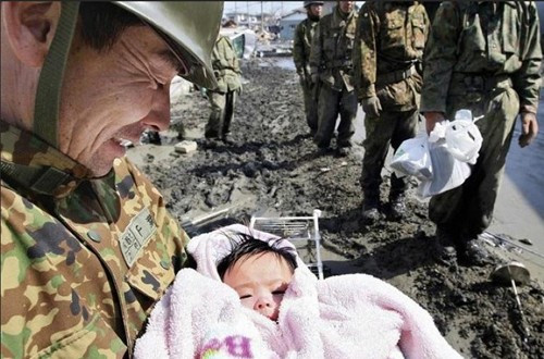4 ngày sau trận động đất và sóng thần ở Nhật Bản tháng 3/2011, những người lính cứu hộ tìm thấy một em bé 4 tháng tuổi còn sống sót trong đống đổ nát. Bức ảnh tạo niềm tin về những kỳ tích trong thảm họa. Ảnh: Buzzfeed.