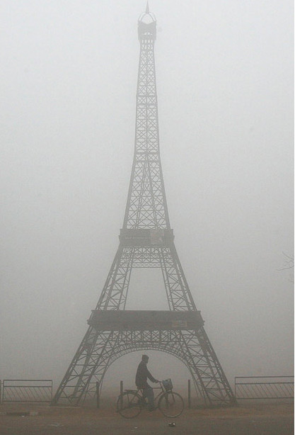 Một người đàn ông đạp xe trước “bản sao” của tháp Eiffel trong sương mù dày đặc vào một buổi sáng lạnh ở thành phố Chandigarh, phía Bắc Ấn Độ.