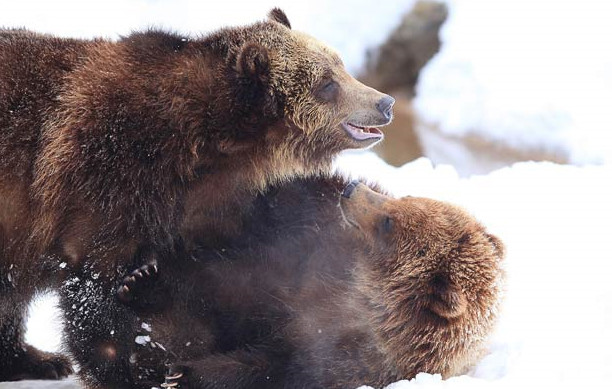Những con gấu nâu đùa giỡn với tuyết ở sở thú Bronx, thành phố New York, Mỹ