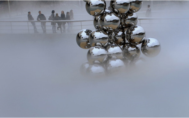 Học sinh thích thú chiêm ngưỡng tác phẩm nghệ thuật “Tall Tree an The Eye”của Anish Kapoor (Ấn Độ) được bao phủ bằng sương mùa tạo bởi nghệ sĩ Nhật Bản Fujiko Nakama tại Bảo tàng Guggenheim ở thành phố Bilbao, Tây Ban Nha.