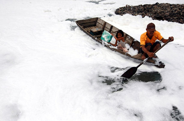 Hai bố con người Indonesia đang băng qua một khúc sống bị ô nhiễm ở Jakarta, Indonesia.