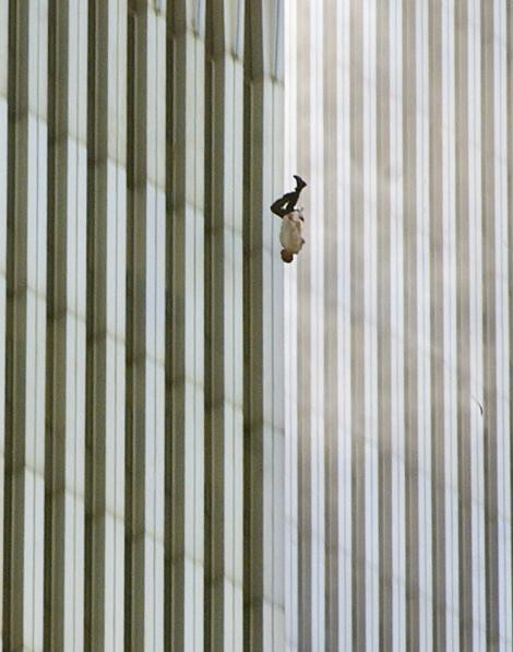 Bức ảnh “The Falling Man” nổi tiếng, ghi lại cảnh một người đàn ông không rõ danh tính lao ra khỏi tòa Tháp đôi tự sát trước khi tòa nhà đổ sụp. Ngày hôm đó, có tới hàng trăm người đã tự tử theo cách này. Ảnh: AP