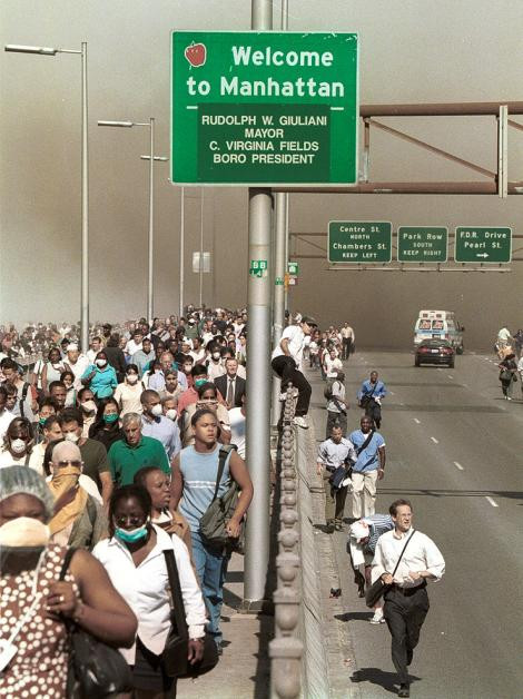 Hàng ngàn người bỏ chạy khỏi đám khói bụi sau lưng trên cầu Brooklyn. Trên đầu họ là tấm biển “Chào mừng đến Manhattan”. Ảnh: AP