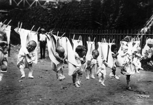 3. Địu bé treo lơ lửng ngoài trời: Bức ảnh này được chụp khoảng những năm 1920, các em bé được treo như móc quần áo ở ngoài trời. Chưa rõ mục đích của việc làm này là để tắm nắng hay cho các bé chơi, nhưng có vẻ như nhiều bé không thoải mái với việc này
