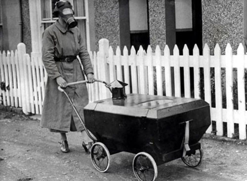 4. Xe đẩy chống khí gas cho bé ở Thế chiến thứ 2: Để chống độc cho bé, nhiều gia đình thiết kế những chiếc xe đẩy kín mít, có phần thông khí như ống khói phía trên.