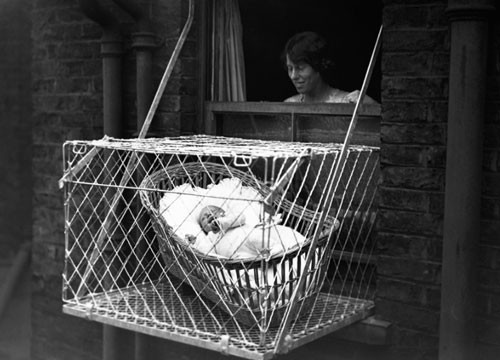 1. Lồng sắt lơ lửng cho bé ngoài cửa sổ: Khoảng những năm 1930, ở châu Âu thịnh hành những chiếc lồng sắt treo ngoài cửa sổ cho các bé tắm nắng hoặc chơi bên ngoài, ngắm nhìn không gian.