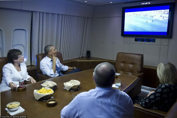 Tổng thống Mỹ Barack Obama và các cố vấn xem trên chiếc máy bay "Air Force One" trong chuyến đi Minneapolis để tham dự một cuộc họp.