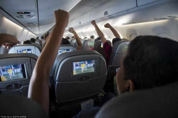 Fan Brazil trên máy bay ăn mừng bàn thắng của Neymar vào lưới Cameroon ở vòng bảng