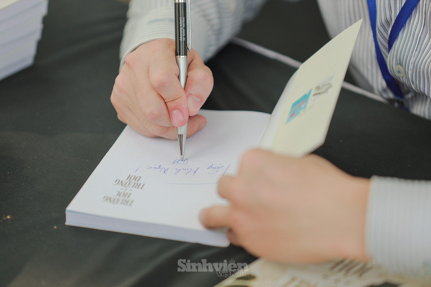 | Tác giả, nhà báo Nguyễn Tuấn Anh có một buổi ký tặng sách "vất vả" khi Trường học và Trường đời bản in 2024 được giới thiệu tới hàng ngàn sinh viên tại lễ hội. |