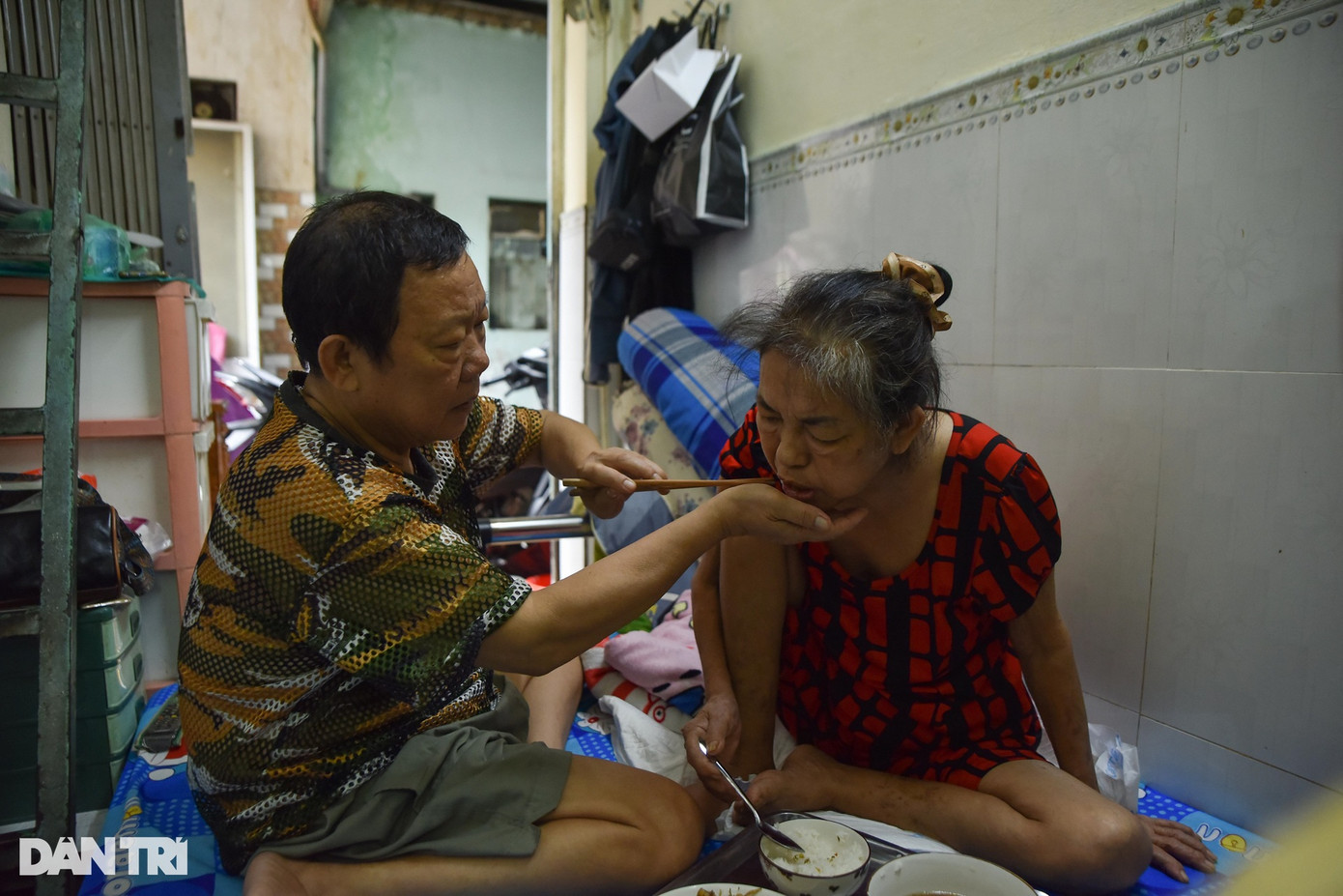 Căn nhà vẻn vẹn hơn 6m2, vừa chăm sóc vợ, vừa phải đi làm kiếm thêm thu nhập, ông Trương Tuấn Kiệt (61 tuổi) chia sẻ: ''Căn nhà nhỏ nên cuộc sống cũng chật vật lắm. Tôi đi làm phụ hồ còn vợ bán cơm, từ lúc vợ tôi bị bệnh nên tôi ở nhà chăm sóc. Điều trị tốn nhiều kinh phí, thỉnh thoảng tôi muốn đi làm kiếm tiền thì nhờ con sang trông vợ''.