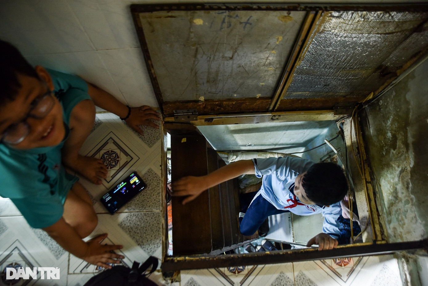 Căn nhà ông Hùng rộng khoảng 6m2 cũng là nơi sinh hoạt, nghỉ ngơi của cả gia đình gồm 5 người. Trong ảnh, Khang (12 tuổi) đang di chuyển lên gác sau giờ học bằng cầu thang thẳng đứng vì diện tích căn nhà quá hẹp.