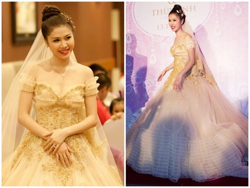 Khi kết hôn cùng Đan Trường, nữ doanh nhân Thủy Tiên đã không ngần ngại chi mạnh tay cho chiếc váy cưới sang trọng và tinh tế thuộc thương hiệu Vera Wang. Chiếc váy cưới đem lại hình ảnh nền nã cho Thủy Tiên mang tên Kendall, nằm trong bộ sưu tập xuân 2013 của Vera Wang, có giá lên tới 15.000 USD (khoảng 315 triệu đồng).