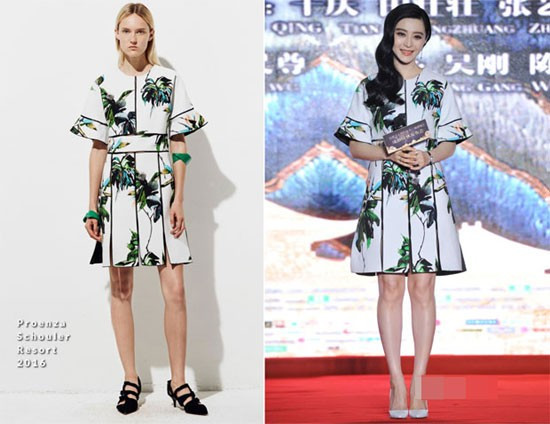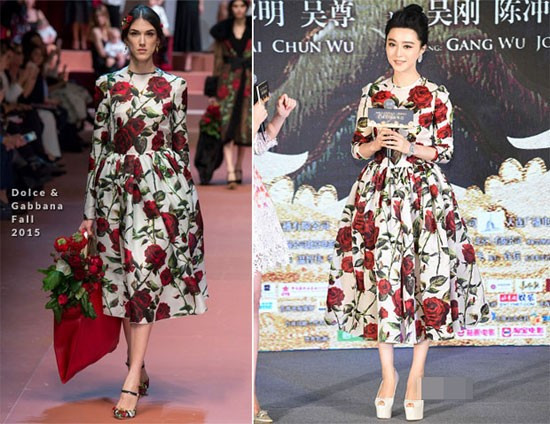 Phạm Băng Băng không tiếc tiền đầu tư cho diện mạo. Bộ váy họa tiết hoa hồng này là của hiệu Dolce & Gabbana. Cô mặc khi tham dự họp báo Lady of the Dynasty tại Bắc Kinh ngày 22/7.