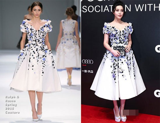 Phạm Băng Băng tới tham dự sự kiện Người đàn ông của năm do tạp chí GQ tổ chức ở Thượng Hải ngày 14/9. Cô được khen ngợi đẹp hoàn hảo với bộ váy trễ vai nằm trong bộ sưu tập xuân 2015 của hiệu Ralph & Russo.