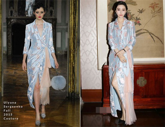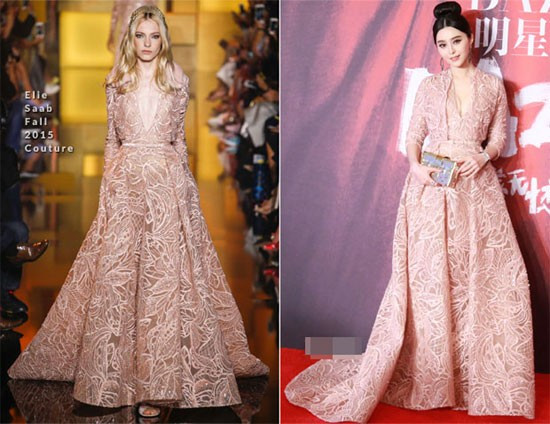 Phạm Băng Băng khoe vòng một tròn đầy khi xuất hiện tại buổi họp báo Yang Gui Fei diễn ra tại Thượng Hải ngày 13/6. Váy nằm trong bộ sưu tập xuân 2015 của Ashi Studio Couture.