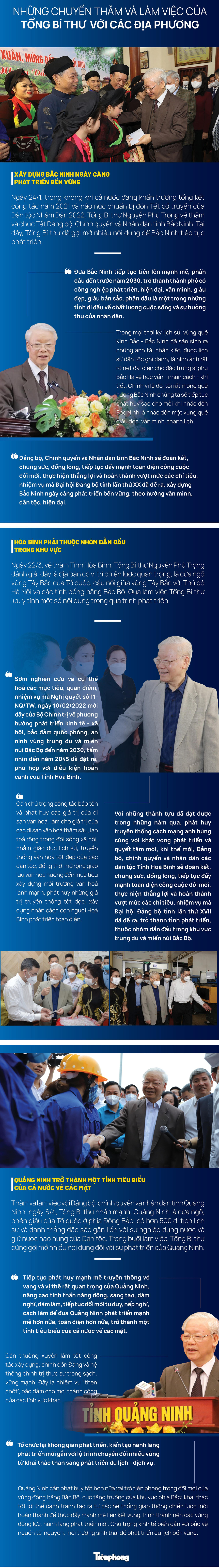 TPO - Từ đầu năm 2022 đến nay, Tổng Bí thư Nguyễn Phú Trọng đã liên tiếp có các chuyến thăm, làm việc với các địa phương như Bắc Ninh, Hòa Bình và Quảng Ninh. Tại những nơi này, Tổng Bí thư đã có những động viên, chỉ đạo để các địa phương tiếp tục phát huy những thành tựu và khắc phục những bất cập, hạn chế trong quá trình phát triển.