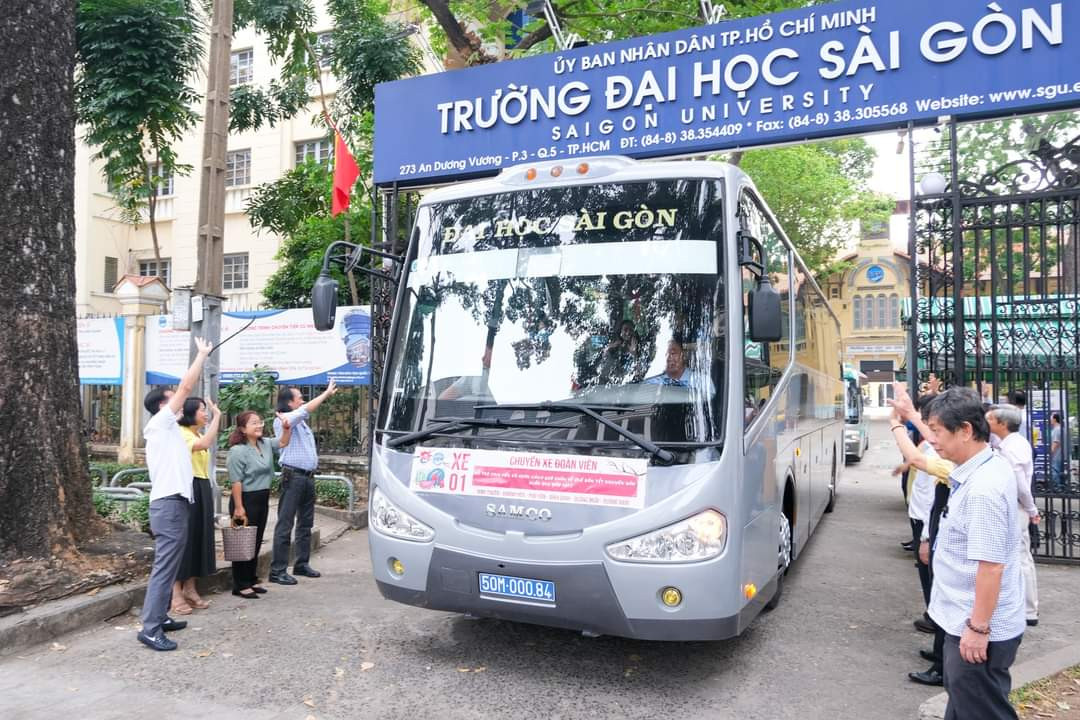 | Lãnh đạo trường ĐH Sài Gòn lên xe tiễn sinh viên về quê đón Tết. |