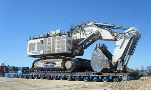 Một chiếc xe vận chuyển chở cỗ máy xúc.