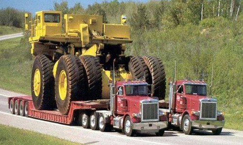 Cặp xe đầu kéo chở cỗ máy khổng lồ.