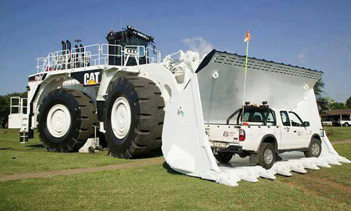 Xe bán tải nằm gọn trong gầu xúc siêu khủng.