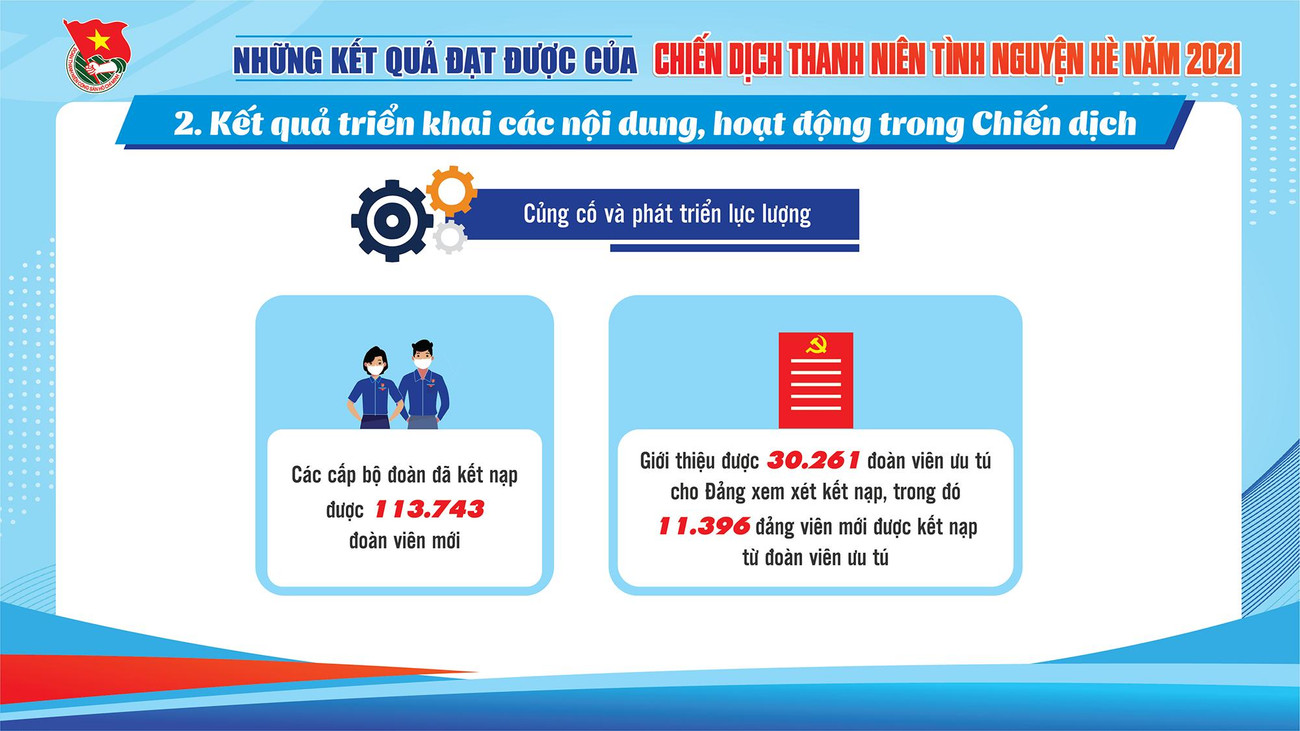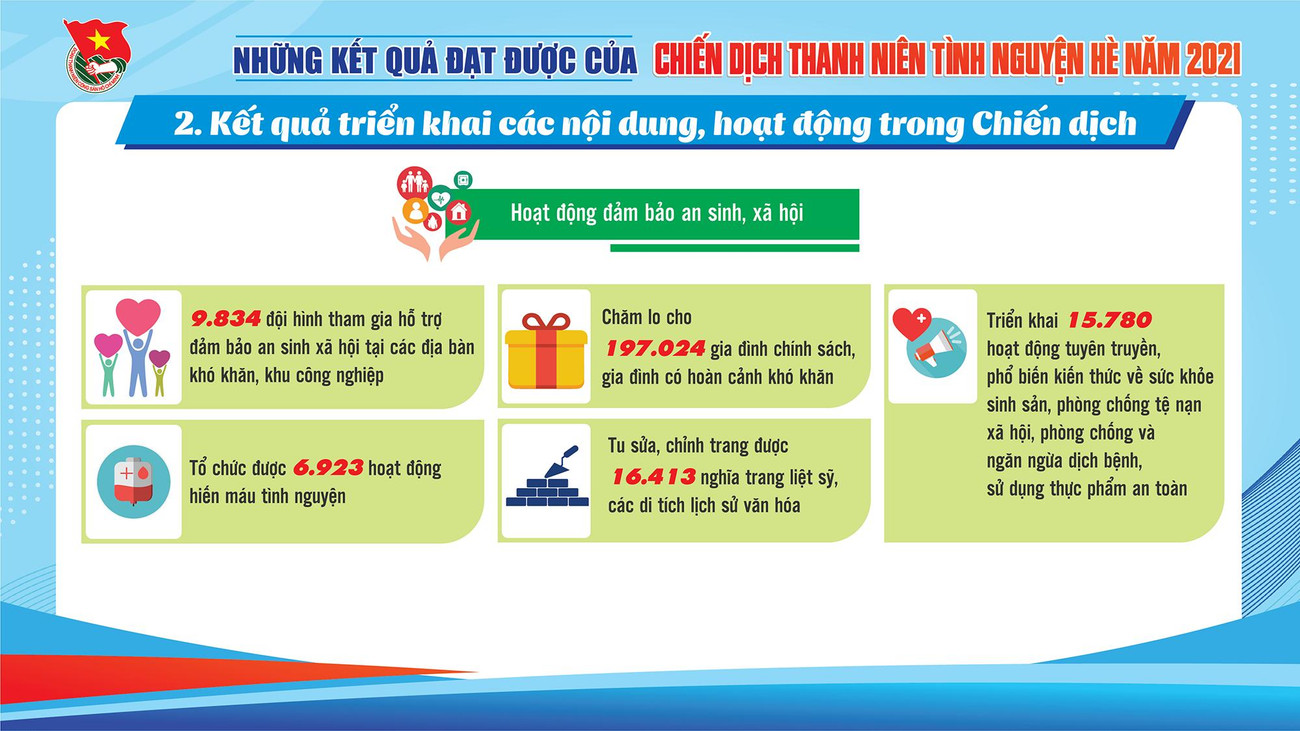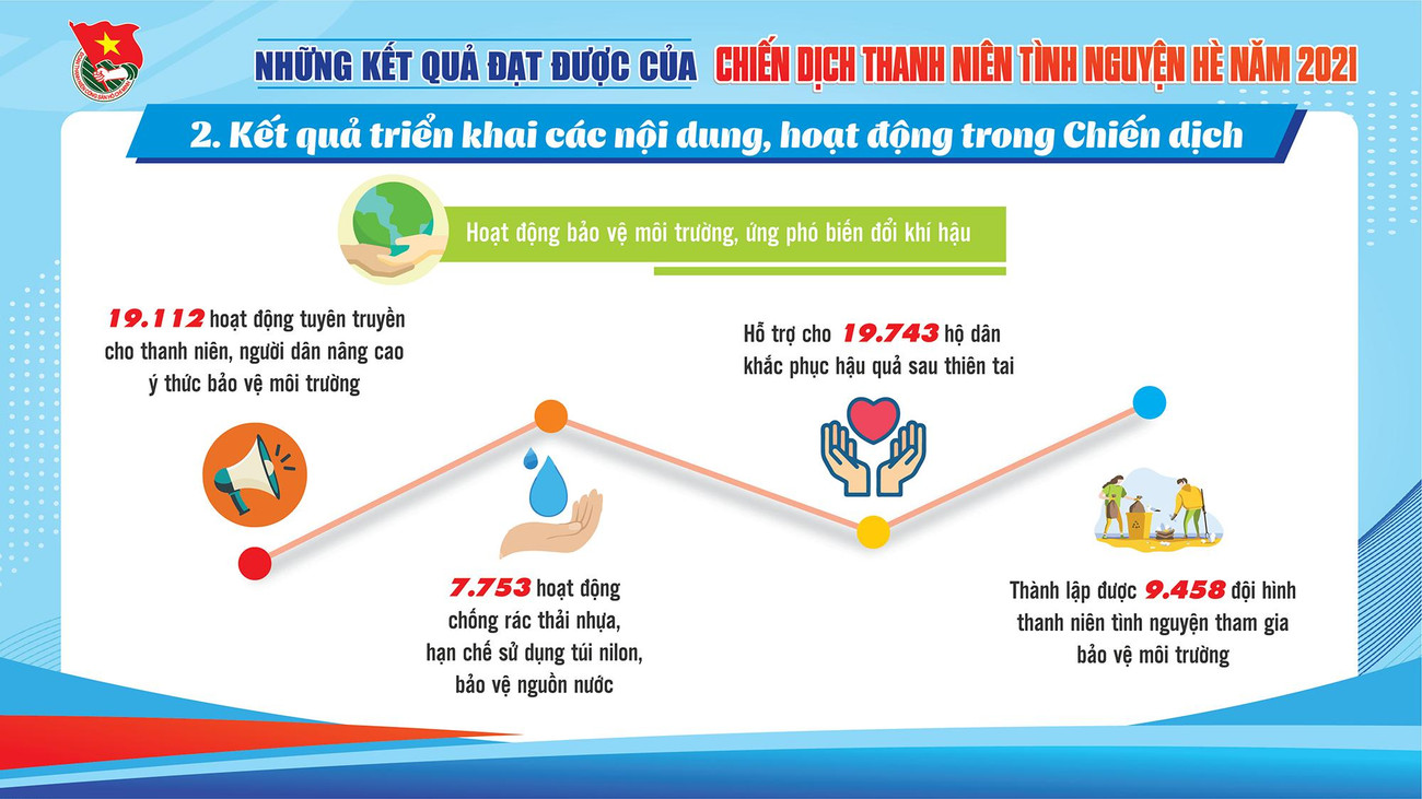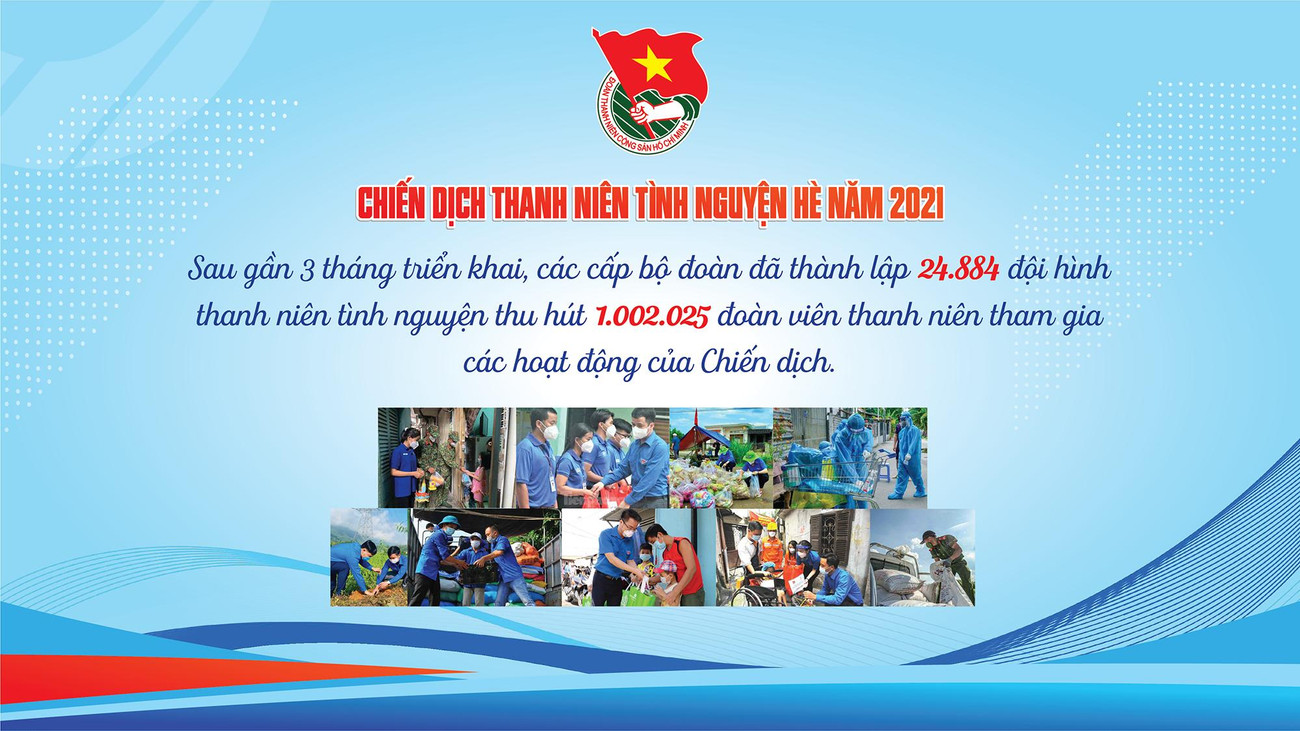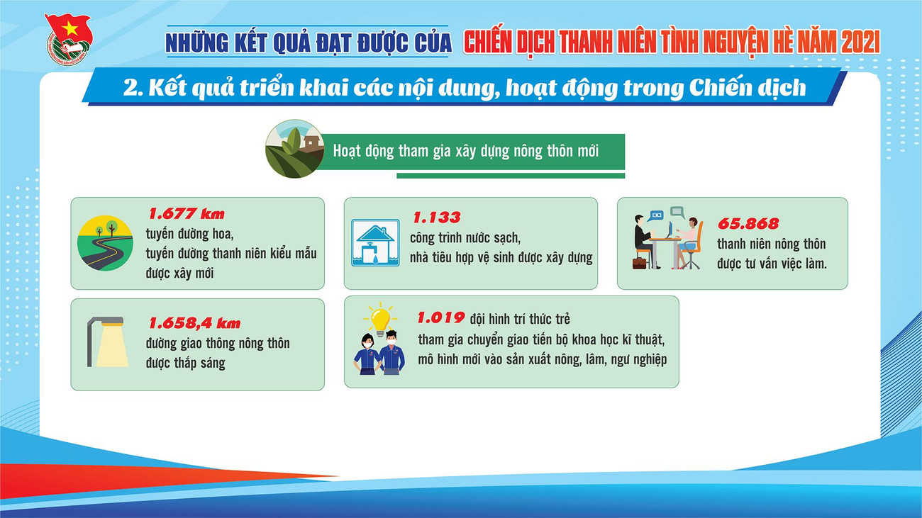 SVO - Qua 3 tháng tổ chức Chiến dịch "Thanh niên tình nguyện Hè" năm 2021, tuổi trẻ cả nước đã thắp sáng gần 1.700km đường giao thông nông thôn, xây dựng hơn 1.100 công trình nước sạch, nhà tiêu và gần 9.000 công trình, phần việc đô thị văn minh; tư vấn việc làm cho gần 66.000 thanh niên nông thôn; hỗ trợ gần 20.000 hộ dân khắc phục hậu quả thiên tai.
