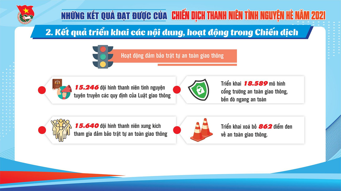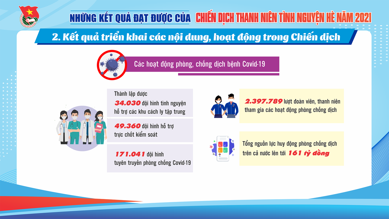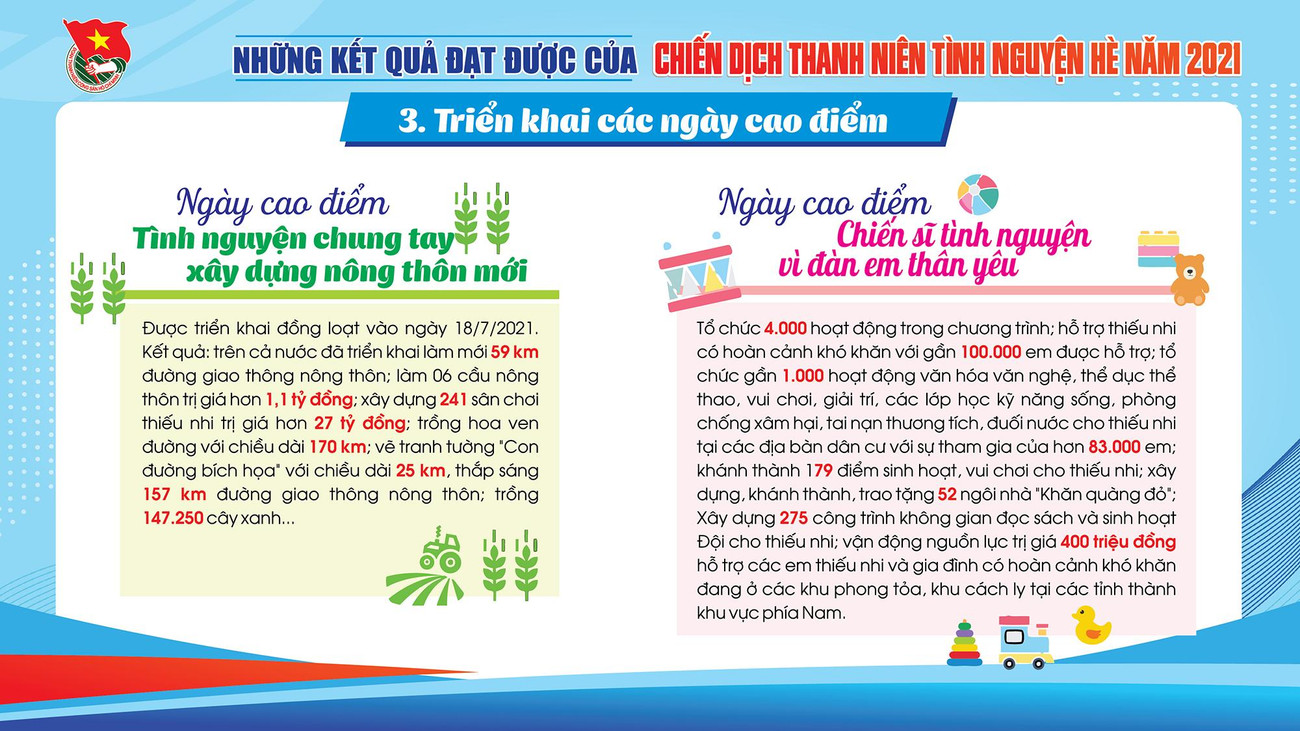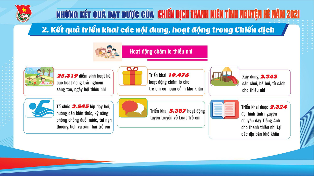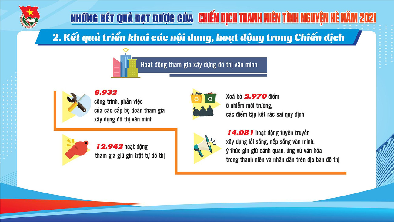 SVO - Qua 3 tháng tổ chức Chiến dịch "Thanh niên tình nguyện Hè" năm 2021, tuổi trẻ cả nước đã thắp sáng gần 1.700km đường giao thông nông thôn, xây dựng hơn 1.100 công trình nước sạch, nhà tiêu và gần 9.000 công trình, phần việc đô thị văn minh; tư vấn việc làm cho gần 66.000 thanh niên nông thôn; hỗ trợ gần 20.000 hộ dân khắc phục hậu quả thiên tai.