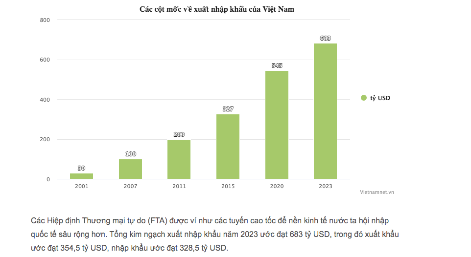 Các Hiệp định Thương mại tự do (FTA) được ví như các tuyến cao tốc để nền kinh tế nước ta hội nhập quốc tế sâu rộng hơn. Tổng kim ngạch xuất nhập khẩu năm 2023 ước đạt 683 tỷ USD, trong đó xuất khẩu ước đạt 354,5 tỷ USD, nhập khẩu ước đạt 328,5 tỷ USD.