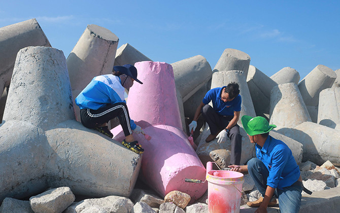 Sinh viên tình nguyện tham gia sơn bờ kè dọc biển trên đảo Phú Quý, Bình Thuận.