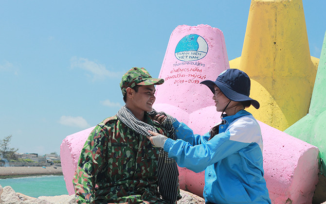 Vừa trở về đất liền, Nguyễn Tuyết Nhi (năm thứ hai, khoa Sư phạm, trường ĐH Thủ Dầu Một) vẫn còn nguyên vẹn cảm xúc những ngày tình nguyện trên đảo Phú Quý. Nhi được giao nhiệm vụ sơn sửa nhà cho gia đình neo đơn. “Khi chúng mình sơn nhà cho cụ, cụ cứ đứng nhìn theo, mắt hấp háy cười. Hình ảnh đó khiến chúng mình vừa thấy thương cụ, vừa cảm thấy hạnh phúc vì việc làm của mình được đón nhận, mang lại niềm vui cho cụ. Chúng mình nhắc nhau phải làm thật tốt, thật đẹp”. Tuyết Nhi bị say sóng nhưng khi đặt chân lên đảo, đón nhận tình cảm thân thiện, yêu thương của người dân mọi mệt mỏi của Nhi dường như tan biến. Những ngày trên đảo, đội tình nguyện nhận được sự chia sẻ của người dân: “Nhiều người dân cho chúng mình thêm rau, thêm cá, thịt, bảo “ăn đi, lấy sức còn làm”. Những chuyến đi thế này khiến cho người trẻ chúng mình thêm tự hào, thêm yêu biển đảo Tổ quốc”.