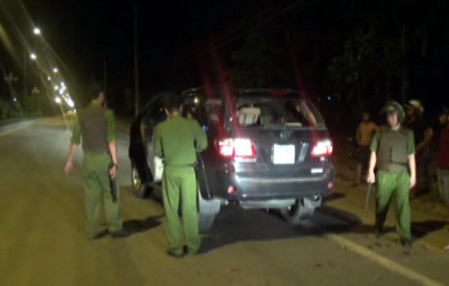 Cảnh sát chốt chặn nhiều ngả đường đã khống chế được 3 người trên xe Fortuner biển số Bình Định cùng một taxi chở 2 thanh niên.