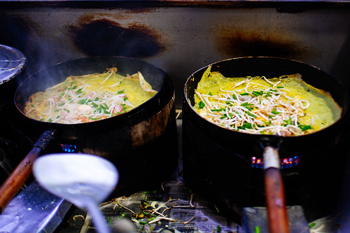 Bánh xèo chảo nóng hổi, người bán lấy ra là đem liền cho thực khách.