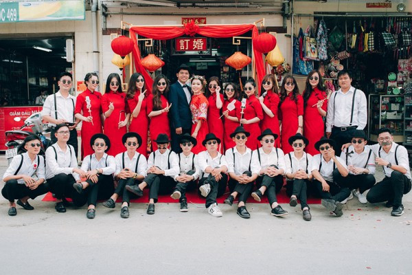 Dàn bê tráp gồm 15 người, là bạn bè tại trung tâm Anh ngữ mà cô dâu làm việc. Chia sẻ về những khoảnh khắc thú vị, dù đến từ các quốc gia khác nhau, họ đều cảm thấy hào hứng khi lần đầu tiên trải nghiệm nét văn hóa đẹp này của Việt Nam.