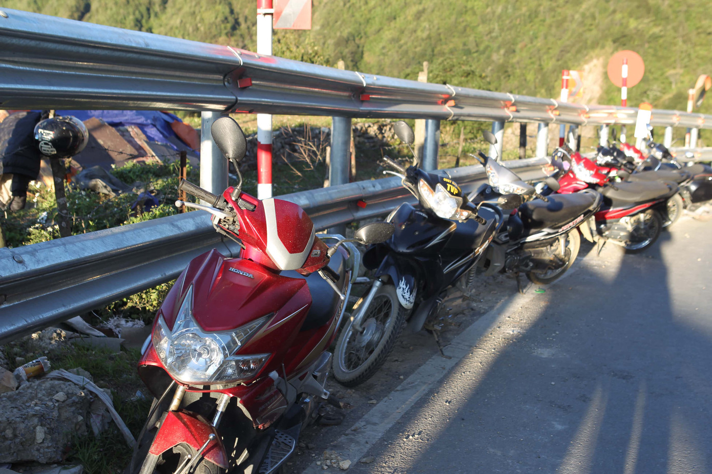 Xe máy của khách du lịch dừng lại chụp ảnh dựng ngay trên đường