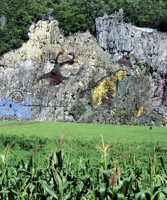 Bức tường này là điểm dừng phổ biến cho xe buýt tham quan trong ngày ở vùng núi Viñales. Du khách phải trả khoản phí khoảng 15 USD để xem các bức tranh tường sặc sỡ. Trớ trêu ở chỗ nó được vẽ vào năm 1961 vì vậy không có gì liên quan đến tiền sử.