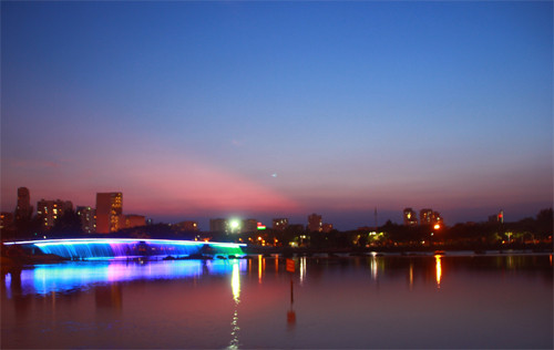 Sau khi ngắm hoàng hôn xong ở hồ Bán Nguyệt, bạn có thể tiếp tục xem khung cảnh tuyệt đẹp của cầu Ánh Sao với những tia nước nhiều màu sắc.