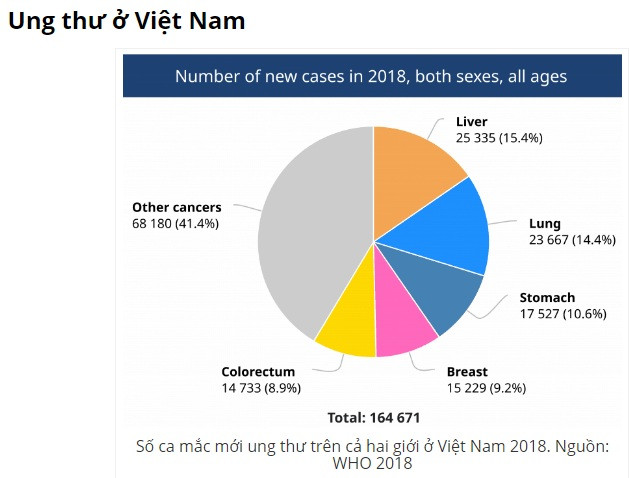 Ở Việt Nam, năm 2018 dân số chúng ta đạt gần 96,5 triệu người, con số mắc ung thư mới trong năm là 164.671 người, với 114.871 ca tử vong.